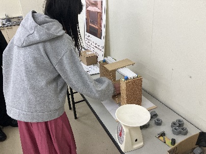 中学生、高校生だけでなく、家族連れで来ておられた、小学生のお子さん2名も参加いただけました。重りを徐々に増やしていき、橋自体の何十倍もの重さを載せても、壊れない様子に、ワクワクドキドキで、大変盛り上がりました。